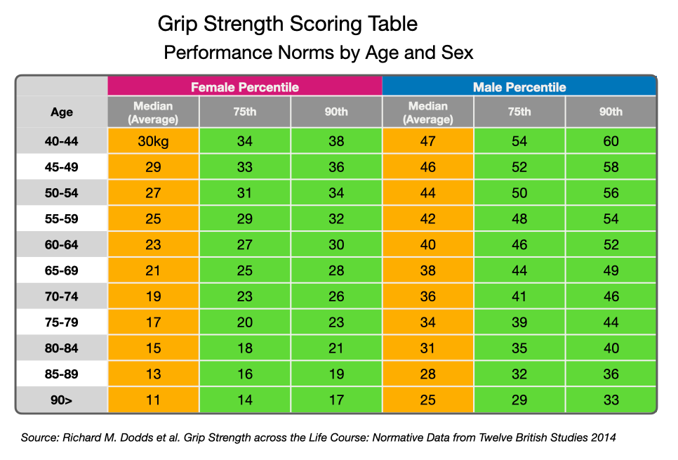 For example, my best score as a 65 year-old was 47kg. This places me above average for my age and sex and gives me the average grip strength of a 40-44 year-old. I’ll take that!